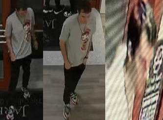 Suspect(s) Description: white male, brown hair, mid twenties approximately 5’8″ and medium build, about 160lbs. He was wearing a grey amine t-shirt with an animated character, dark pants and tennis shoes. He had on a leather necklace and a leather bracelet on his left