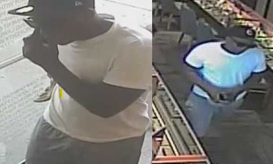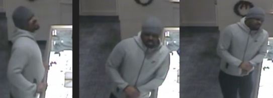 Suspect(s) Description: Male, Caucasian or Hispanic, 5’8, 50-60 years old, black hat, black face mask, black Champion hoodie, grey sweatpants, black and white shoes