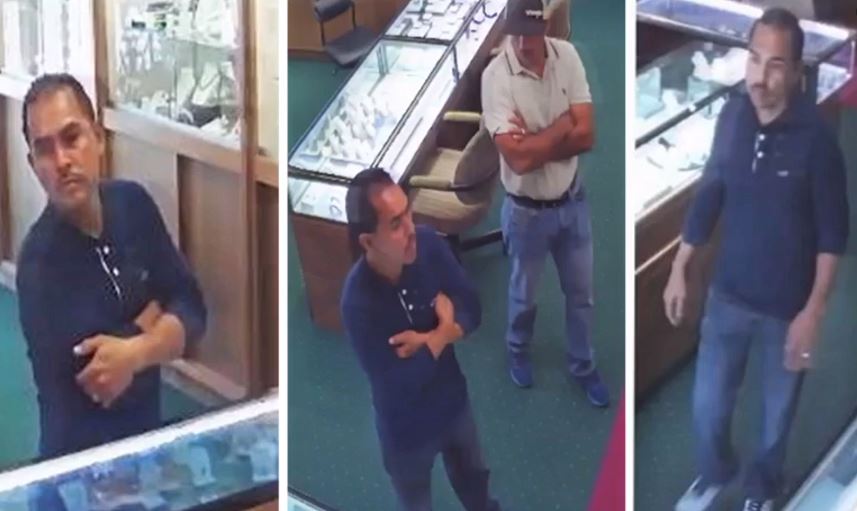 The suspect in the hat conversed with a woman who appeared to be a customer. As her attention was diverted from a display case, the suspect in the dark shirt reached into the case and removed jewelry.