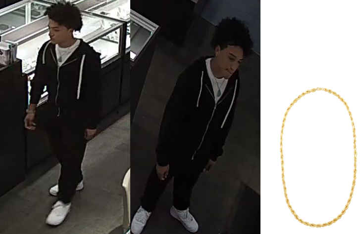 El Cajon, CA– On January 20, 2025, a jewelry store experienced a grab & run theft incident. Upon entry into the store, the suspect inquired about Rolex watches then gold chains. While viewing a 24-inch gold rope chain, the suspect ran off with it in his possession. El Cajon Police Department was notified.