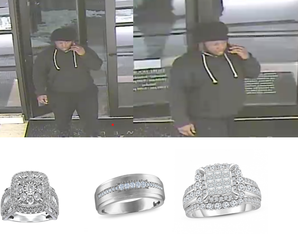 Indianapolis, IN- On January 09, 2025, a lone male entered the store in the Castleton Mall and said he wanted to buy a Bridal Set and a Men’s wedding band and wanted them to match. He spent over an hour in the store shopping with the one associate. He wanted to compare the 3 rings to find what matched best. When all 3 pieces were out, he grabbed them and ran out of the store. Both Mall Security and Police were called. No injuries were reported.