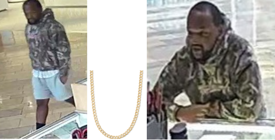 can only show one item at a time. The male selected a necklace, concealed the necklace in his hoodie pocket and fled the store. Mall security were notified and responded.