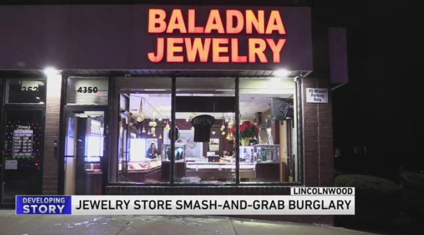 According to police, officers arrived at Baladna Jewelry in Lincolnwood, located in the 4300 block of Touhy Avenue, around 4:45 p.m. for a smash-and-grab burglary.