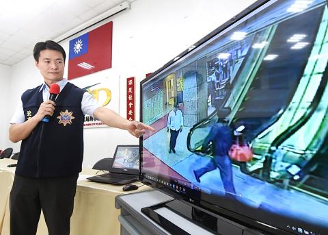 A Police officer shows surveillance footage of the suspects from Taiwan’s Jewelry & Gem Fair theft.