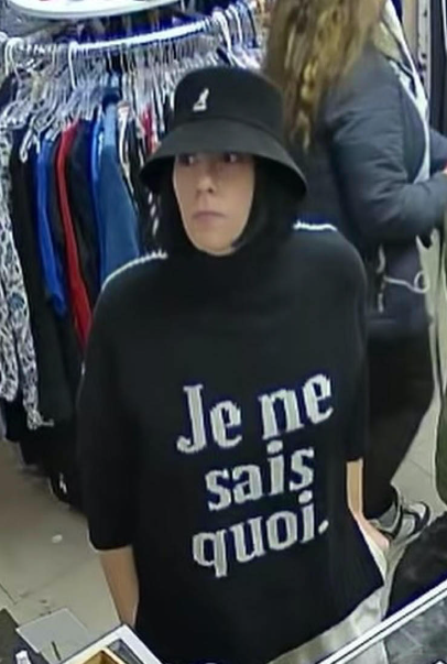 The thief appears female and is wearing a black sweater that says “Je ne sai quoi” in white lettering, with the hood pulled up under a black bucket hat, the person can clearly be seen taking items from a jewelry tray on the counter and putting them in the pocket of her sweater.