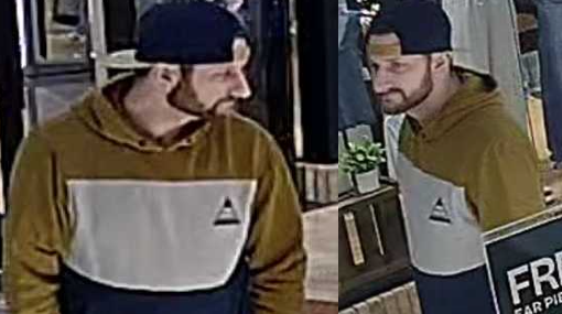 Suspect(s) Description: White male, 40 years, 5’10â€Â, medium build, with a brown or dark colored beard. The suspect wore light colored blue jeans, a tri-colored hoodie sweatshirt – blue/white and mustard yellow. He also wore a dark colored ball cap with a yellow bill.