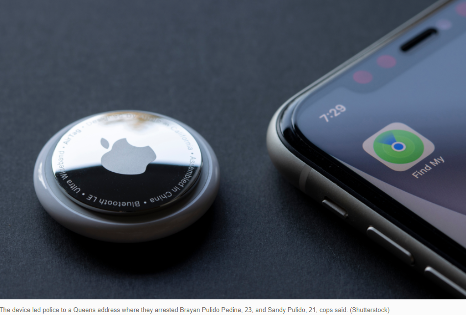 The device led police to a Queens address where they arrested Brayan Pulido Pedina, 23, and Sandy Pulido, 21, cops said. Both suspects were charged with criminal possession of stolen property, reckless endangerment and fleeing police. Pulido Pedina was slapped with an additional charge for resisting arrest.