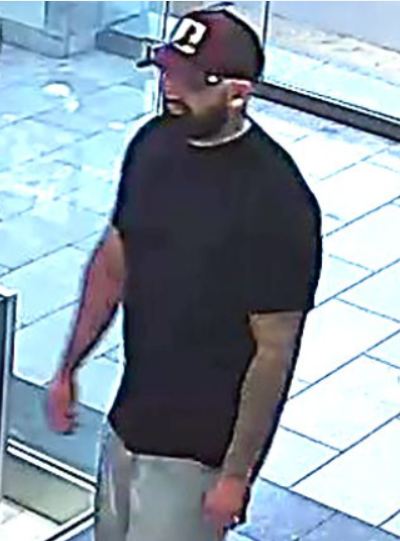 Suspect(s) Description: Male, 30-35yrs. old, Hispanic, 5’8, 170lbs., black hair, black beard, red hat, black t-shirt, denim pants, black shoes, tattoo on left arm