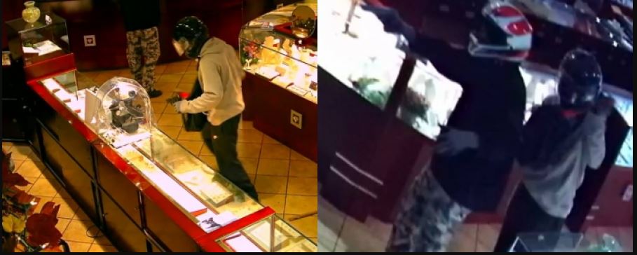 After taking jewelry, the suspects jumped on a black motorcycle and sped off. The suspects wore black hoodies and big black gloves. They were also holding a baton.