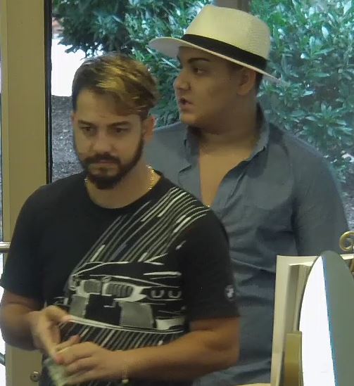 The second subject wore tropical “leaf patterned” pants and a blue linen long sleeve shirt. He also wore flip-flops with a beige hat with a black stripe. The subjects are both approximately 5’8″ and possibly in their 30’s.